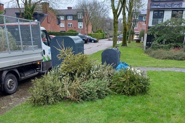 Foto: Kerstbomen bij aanbiedlocatie voor GFT worden opgehaald door de buitendienst van Duo+.