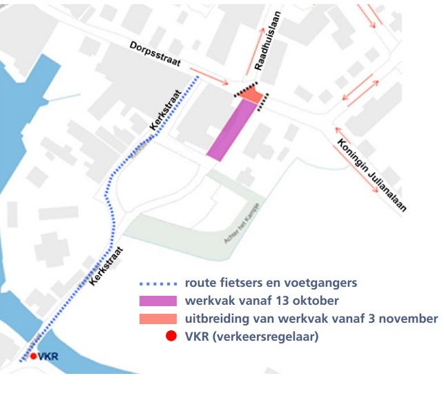 Vanaf maandag 3 november 2025 sluiten we het nieuwe riool in de Korendragerstraat aan op de bestaande rioolputten bij het kruispunt Dorpsstraat, Korendragerstraat. Het verkeer van de Dorpsstraat richting de Koningin Julianalaan wordt omgeleid via Raadhuislaan, Prinses Beatrixlaan Koningin Wilhelminalaan.